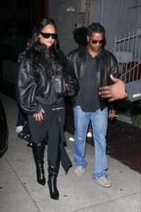 A$AP Rocky coordinated seamlessly, stepping out in a soft black leather bomber jacket over a simple black T-shirt, paired with blue jeans and greige suede sneakers. He accessorized with dark aviator sunglasses, completing the monochromatic vibe. The couple’s matching leather jackets and coordinated color palette highlighted their ongoing trend of dressing in sync—whether on red carpets or casual nights out.